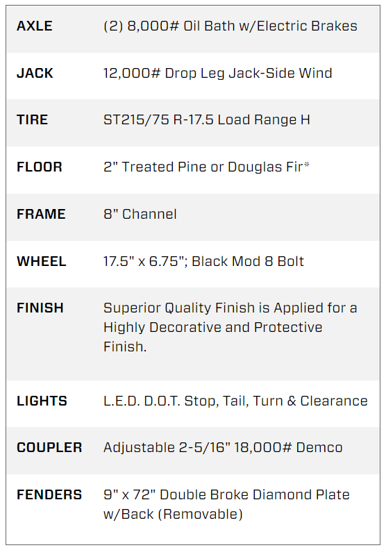 • Axles: Tandem, 7,000 lb each (14,000 lb GVWR)