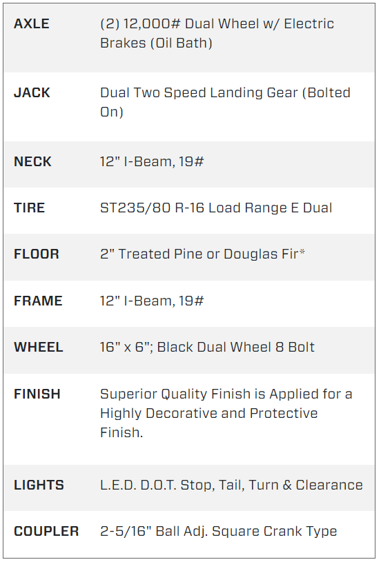 • Axles: (2) 12,000 lb dual-wheel oil-bath brake axles