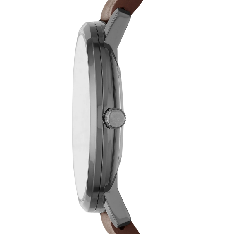The watch includes a stainless steel case paired with a brown PU leather strap. An adjustable buckle provides a comfortable fit, and the mineral glass helps protect the dial from normal wear. Suitable for casual and everyday activities.