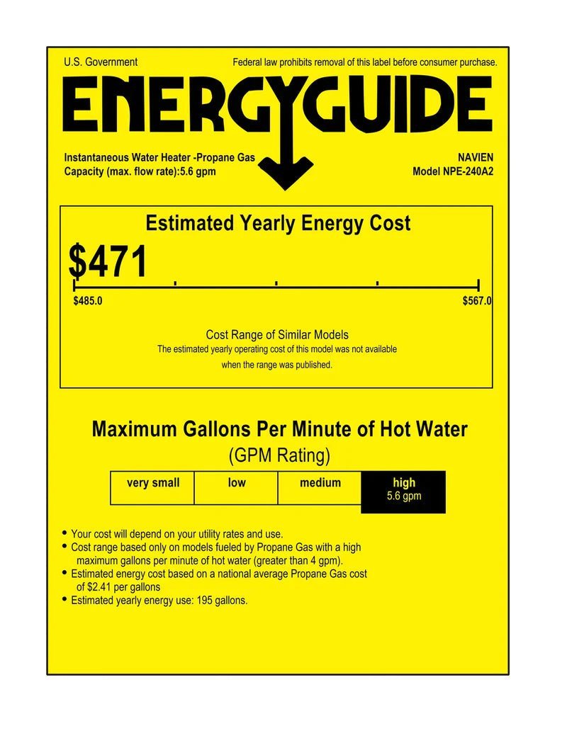 The NPE-240A2 is a high efficiency tankless unit with 199,000 BTU/hr that can provide and endless supply of hot water. The 240A2 has a flow rate of 8.7 GPM at a 45 degree temperature rise and is equipped with built in recirculating technology. Navien units are efficient and reliable making them a fantastic choice as an upgrade for all your hot water needs.