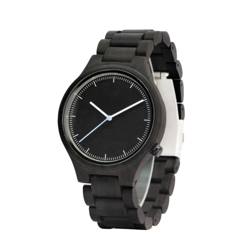 The watch includes a round dial with an analog display and a folding clasp with safety. Its solid wooden construction and simple design make it suitable for casual daily use.