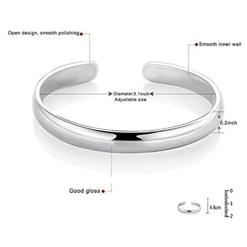 This bangle bracelet is made from sterling silver and features a solid band structure with an adjustable opening. The simple design provides a smooth surface and a minimal appearance that can complement different clothing styles.