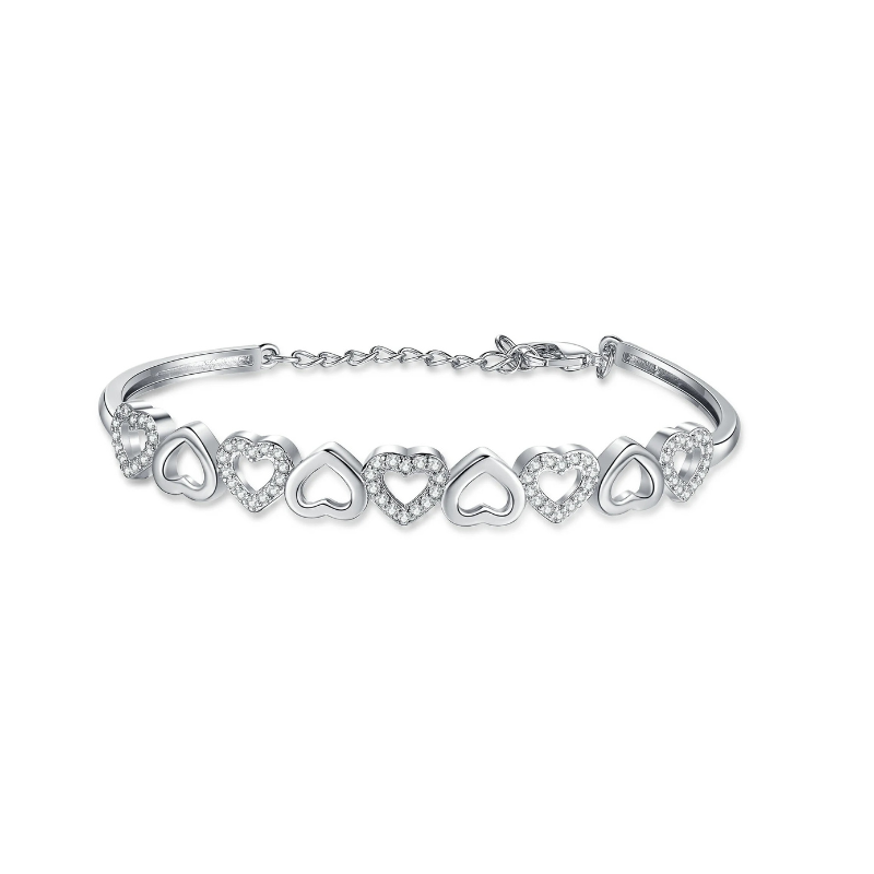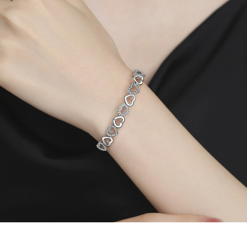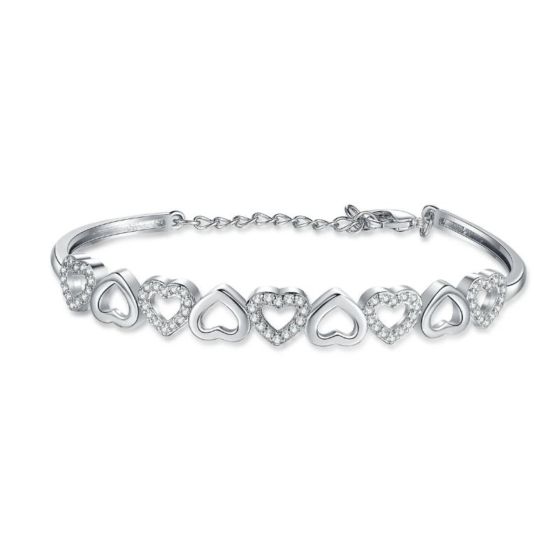 The bracelet’s heart motifs provide a delicate and elegant look, while the crystals enhance its visual appeal. It can be worn alone or layered with other bracelets for a stylish accessory option. This versatile bracelet is a charming addition to any jewelry collection.
