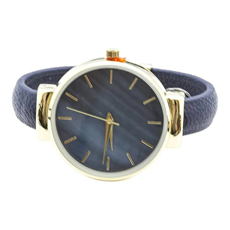 The watch includes a metal case with a navy leather bangle-style strap. The design offers a lightweight structure and simple dial layout for easy reading. It is suitable for indoor activities, casual wear, and daily use.